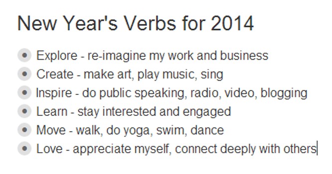 My New Year’s Verbs seem to be something I can live with. When I look at this list I feel energized and inspired. There is an underlying sense of creativity and fun for me. If I want to dance, am I going to go to tango or salsa or tap? All of them would count. Should I sing, practice my guitar, or make a collage? Should I do yoga at home or go to a class? Should I read a book or blog or watch a video or webinar?